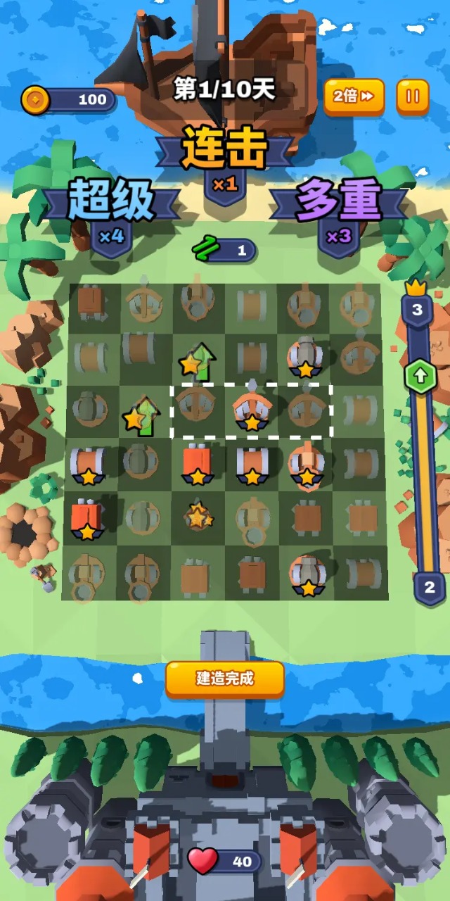 2、通过将相同星级相同类型的炮塔拖动到一起进行合成更高星级的炮台进行防守