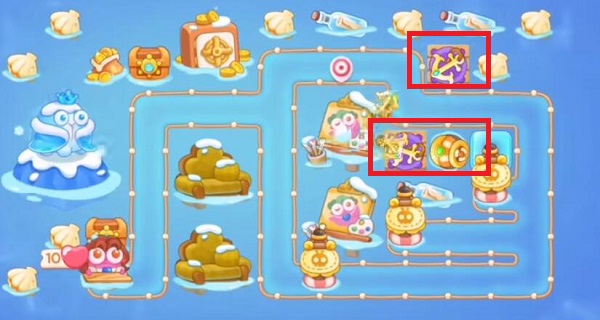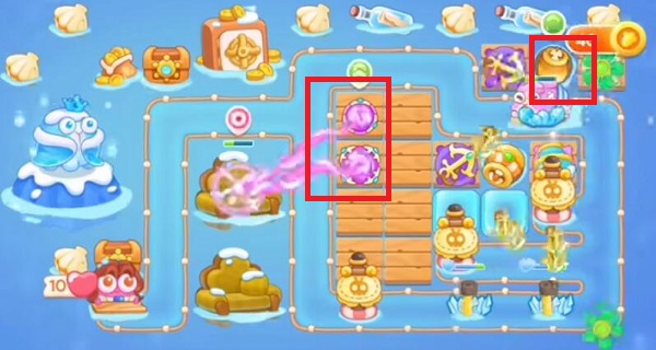 4、第五波左边添加船锚和鱼雷炮,打掉左上方宝箱之后获得一个塔防火瓶。