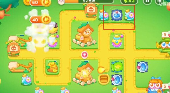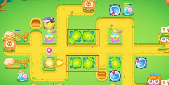 1、首先打开保卫萝卜4官方正版安卓版,我们进入关卡以后,在如图所示的红框位置放置1个分裂炮台,这样我们攻击怪的时候同时也可以攻击其他建筑物。