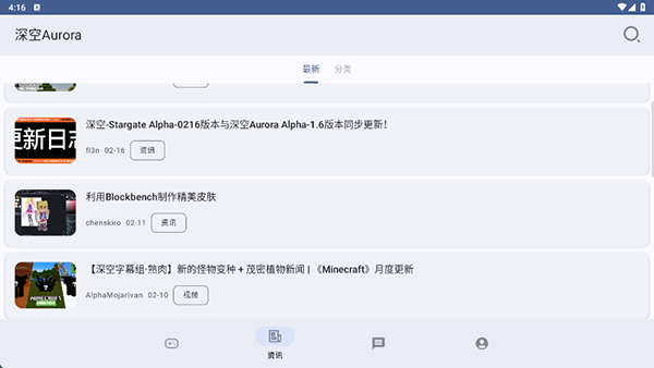 vAlpha-1.2深空盒子(深空Aurora)是一款专业好用,为我的世界手游玩家打造的游戏工具,玩家可以通过这款平台来轻松的下载安装各种我的世界mod进行体验,平台中还有社区功能,你可以与别的玩家一同交流玩法心得,你也可以在这里分享上传各种有趣的mod供大家下载体验。