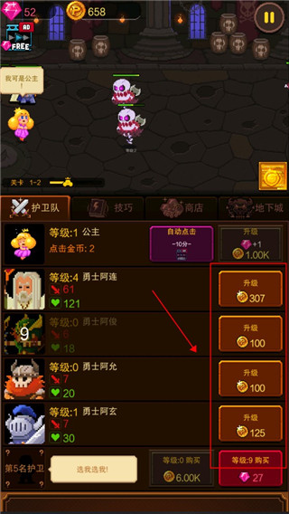 3、当有足够的金币时不要忘记给勇者提升等级,等级越高勇者的各项属性也会增强。