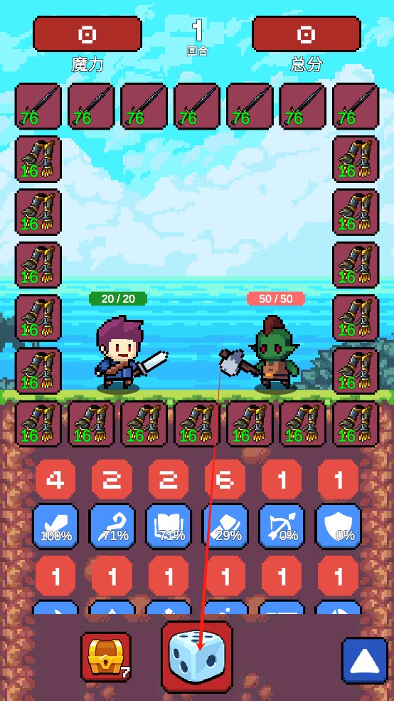 1、这是一个老虎机肉鸽游戏,通过摇奖获得分数来与敌人战斗。当累计得分超过敌人生命值时,战斗胜利。怪物每回合会攻击玩家,当玩家生命值为零时,游戏结束