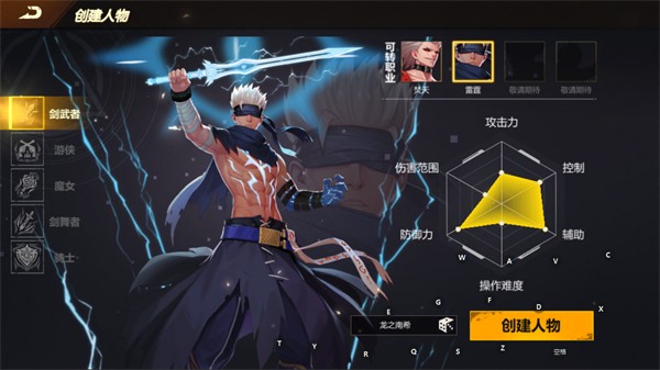 在战争中失去视力,因此觉醒了雷电力量,擅长中远距离打击的剑士,控制技能较多,技能循环良好,辅助能力不错且可使用魔法技能远程攻击。