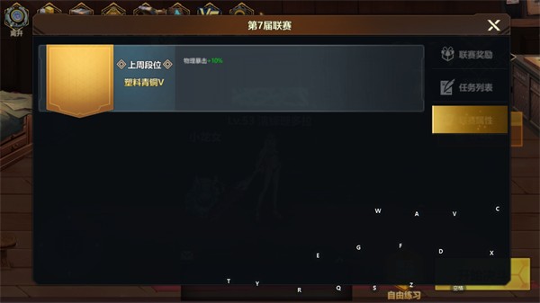 右上角显示的是当前的联赛段位,竞技场段位分为:青铜、白银、黄金、铂金、钻石、王者。根据您上周结算时的段位可以获得一定的属性加成。