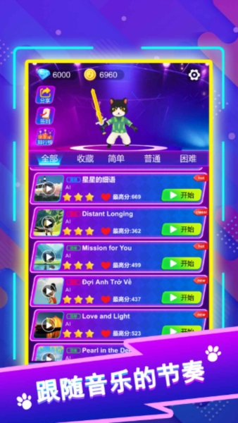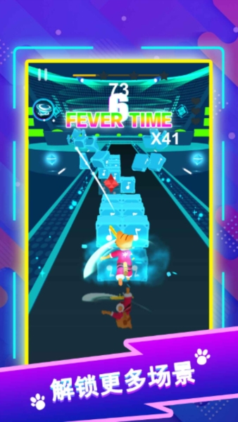 v1.0.0剑舞音乐猫是一款音乐节奏与跑酷元素相结合的冒险跑酷闯关游戏,在游戏中玩家将化身为一只闯关的猫咪,你需要跟随音乐节奏控制猫咪奔跑,同时挥动手中的宝剑将面前阻挡你前进的方块统统砍掉!这样才能获得更多的高分!感兴趣的玩家快来下载试试吧!