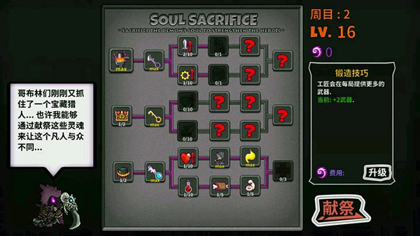 武器是决定游戏进展的最重要筹码之一,在灵魂献祭技能中玩家应该首先把初始获得工匠赠送武器,这样我们在前期最少可以遇见一把品质不错的武器,让我们前几关能更轻松的度过。