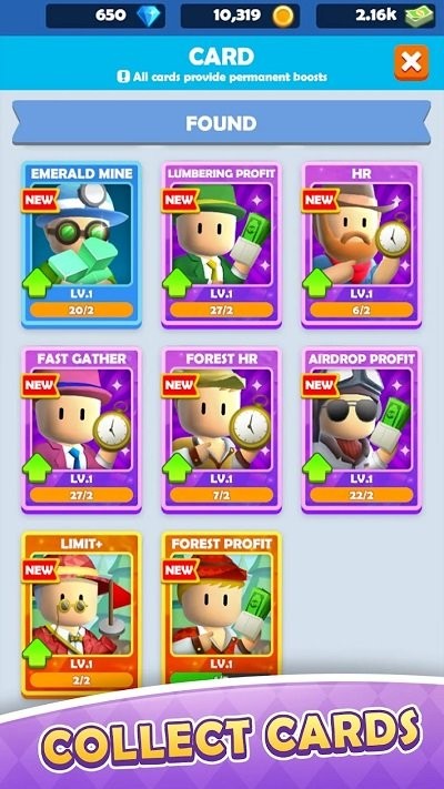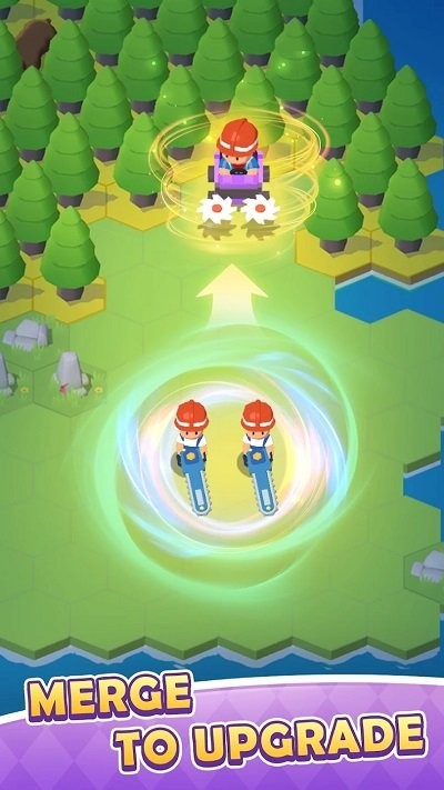 1、随着游戏的深入,合并伐木工人,提升他们的能力,使你的木材生产效率飞速提升。