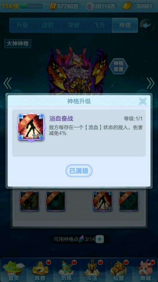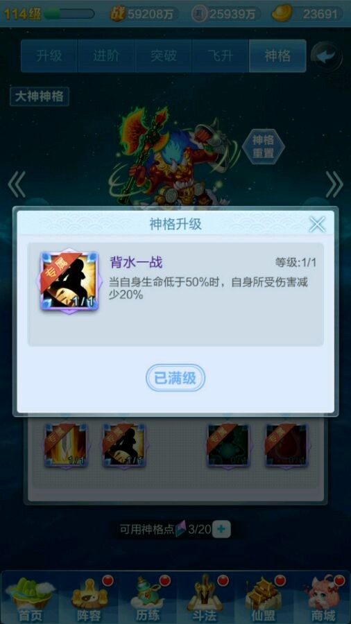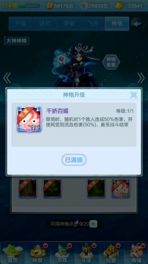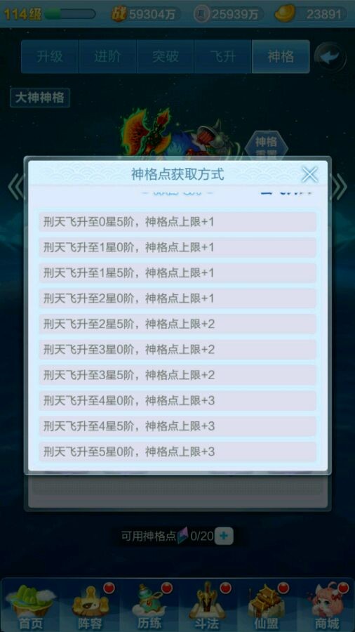 先来给大家说一下神格系统的基础构成:每个神仙都有自己的一套神格,都是有九个技能可以选择,有点类似天赋树,红色神仙有4个专属天赋,而橙色神仙的神格天赋都一样。每个神仙最多有20个天赋点用来点天赋,通过飞升获得天赋点(如下图)
