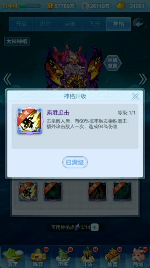 乘胜追击:击杀敌人后,有60%几率再攻击一次,造成94%伤害,有了这个技能再也不怕蚩尤砍错人了,大不了再来一刀……但要注意一点,蚩尤的第二次攻击是没有减怒效果的。
