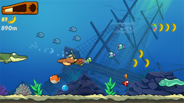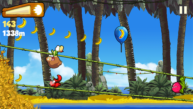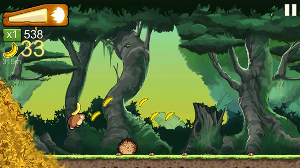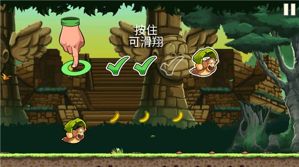 1、奔跑、跳跃、弹跳、在藤条上晃荡,帮助香蕉金刚逃离排山倒海般汹涌而至的香蕉;