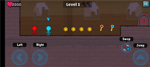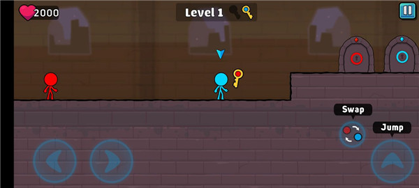 3、只需轻触“交换”按钮,即可从蓝色火柴人变为红色火柴人,反之亦然尽可能多地收集宝石。