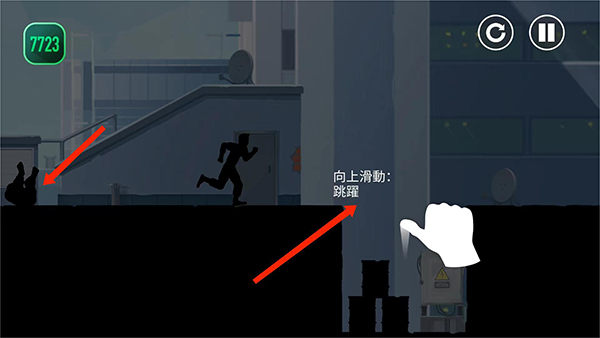 5、进入【游戏界面】,往上滑动屏幕即可起跳,玩家需要利用位置起跳拉开距离甩开后面的追随者,