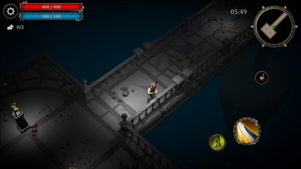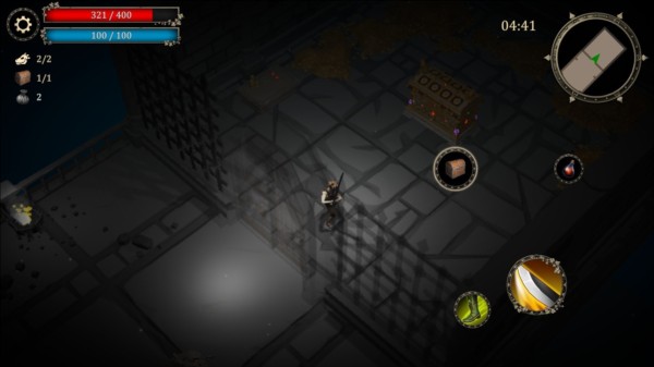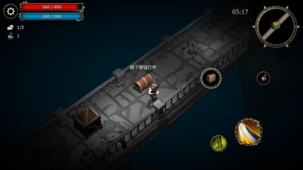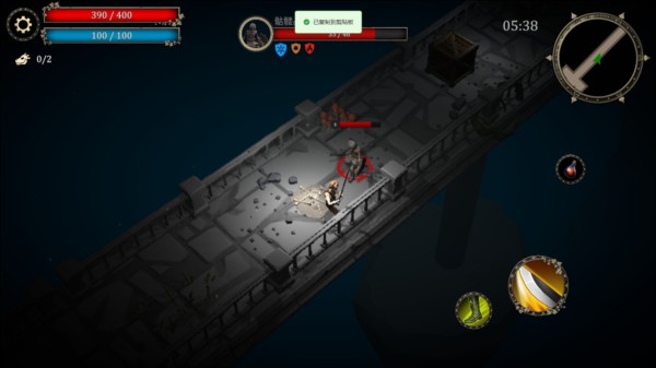 5、游戏操作很简单,左边滑动轮盘进行移动角色,右边鞋子按键是疾驰,刀图标是攻击,点击上方的药瓶可以恢复血量。