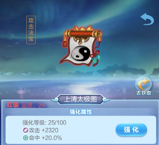 1、通过消耗强化材料强化法宝,强化成功后根据强化成长值提升法宝的强化属性。