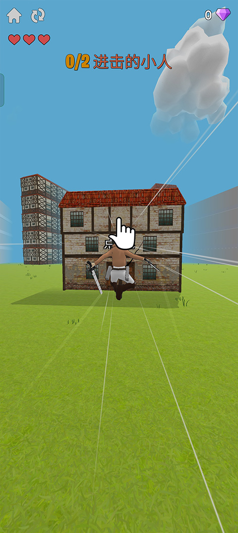 3、也可以点击点击屏幕中的建筑物或者点击巨人使用抓钩来接近巨人的脖子;