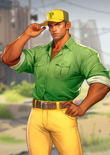 头戴黄帽,身穿绿上衣黄裤子。近两米的身高让他的大长腿可以轻易端飞敌人,让人很难相信他曾经是脑力工作者。