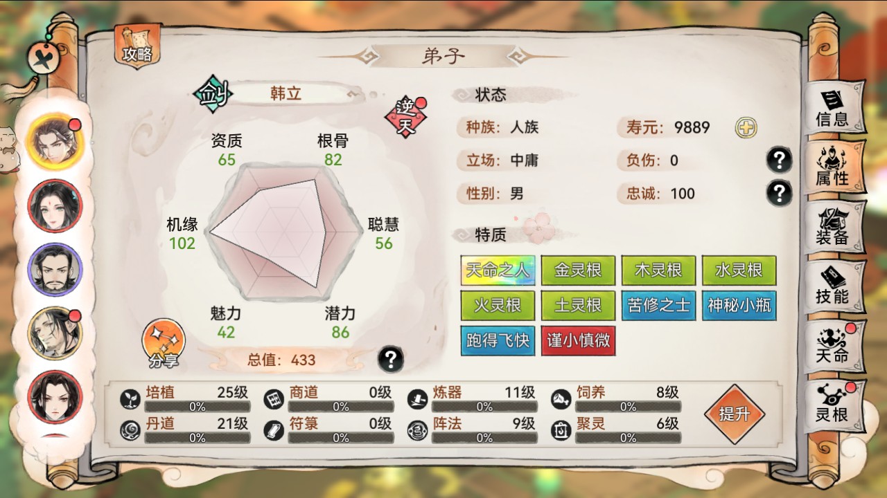 祖师可根据上阵弟子的功法策略,来查看弟子的特质面板,是否有所需要的灵根词条。