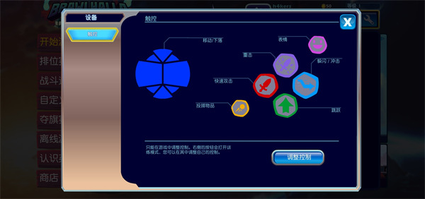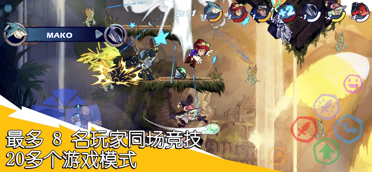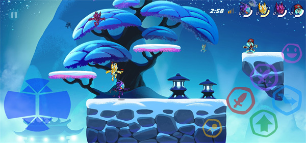 7、游戏的按键也非常有意思,左侧是控制角色移动,右侧紫色的是重击、蓝色的是躲闪/冲击、粉色的是表情、红色的是快速攻击、黄色的是投掷物品、绿色的就是跳跃,整个游戏操作非常简单,感兴趣的小伙伴快来下载体验一番吧。