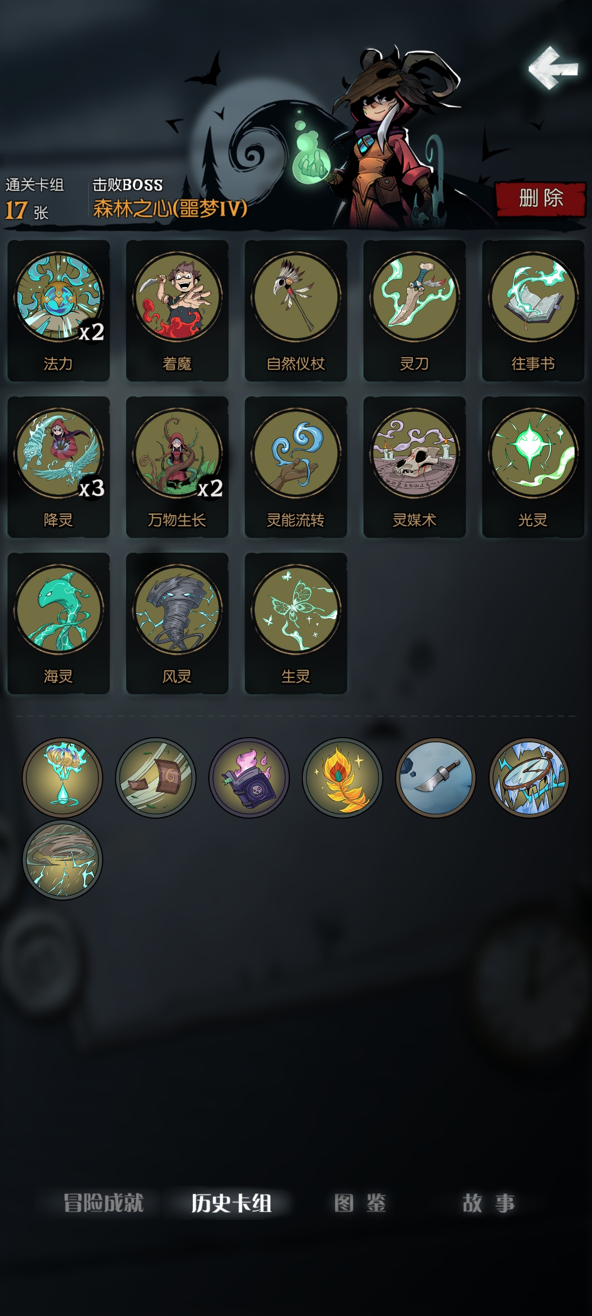 先灵/风灵+雾灵/影灵/海灵。这些都是一些辅助类的素材,配合起来就是打出多段控制或过牌,我有次就是搞了一堆先灵出来,让boss好几个回合都没出几张牌。