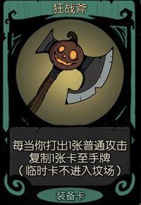 “狂战斧”的重要性不用多说,骑士必选卡牌,最好多多益善,这样的话。装备了几张狂战斧,一刀普通攻击砍过去,就会返回相同数量的普通攻击,理论上可以实现无限砍杀了。