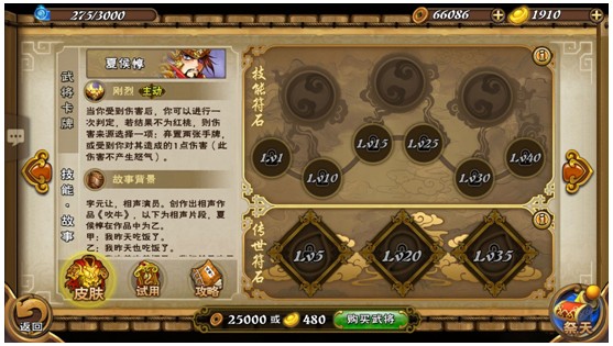 夏侯惇的符石整体质量都不低,练兵增加一点体力上限,这不是卖血最需要的嘛……。援兵回合开始时恢复一点体力,减一点怒气,卧槽自带吃桃,这也是刚烈死对手的节奏了,但需要有怒气;铁甲,如果受到伤害血量大于1则伤害减一,读起来有点绕口,我解释下,对方怒酒杀是三点伤害,则减一点伤害是减两血,同理怒杀就只减一血,不再怕浪费刚烈的次数了,但也需要怒气才能触发。刚勇,受伤就加酒效果,这个是反杀的大好机会,最多一轮可以打出4点伤害直接反杀。诱敌可是夏侯惇三个金色符石里比较使用的一个了,卖血加怒气,再过张牌,比较容易拉开优势。