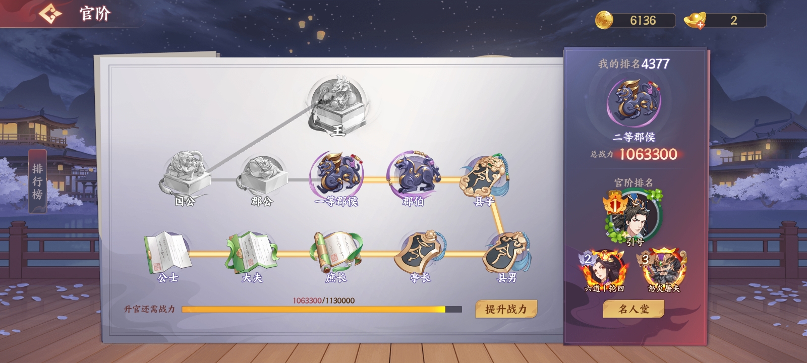 排位赛中,玩家只可以选择自己所拥有的武将,每次选择2个进行比赛。在场上可以随时对于武将进行更换,击败对方两个武将则将会获胜,获得军功,提升自己的军衔。每天根据玩家的军衔不同,还能够获得不同的奖励。军衔到了较高的程度后,躺吃军饷也收获颇丰!