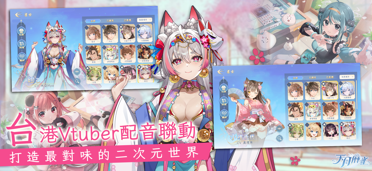 每位角色都有台、港、日三地的本地化配音,令你更投入每场麻将对战!国语配音有超过10位人气台湾VTuber献声,包括真理果、Bana、515、哈鲁、祈Iruni、洛可洛斯特、Aoi、小金碧碧、莱姆薄荷等,不能尽录,总有一位你会喜欢!粤配有VTuber米亚、MK妹及纺灵拉比等等。日配则有超人气实力声优坐镇:包括优木加奈、小仓唯、日笠阳子、内田真礼、鬼头明里、纺木吏佐、天崎滉平、前田诚二等。每位角色均有专属的酷炫胡牌动画、精致动态立绘及搞怪表情贴图。更多VTuber配音及联动活动持续增加中,敬请期待!