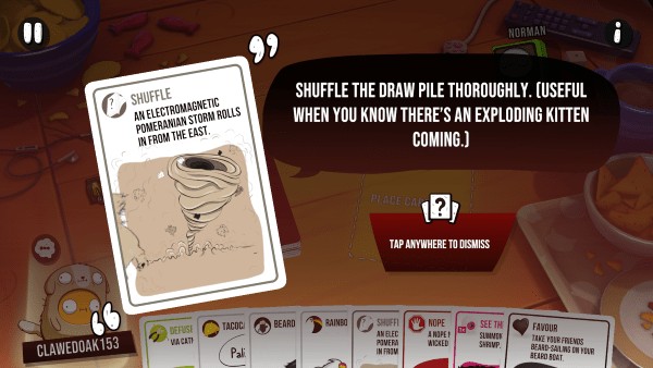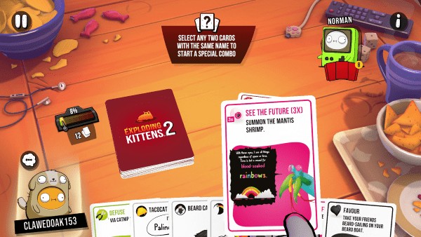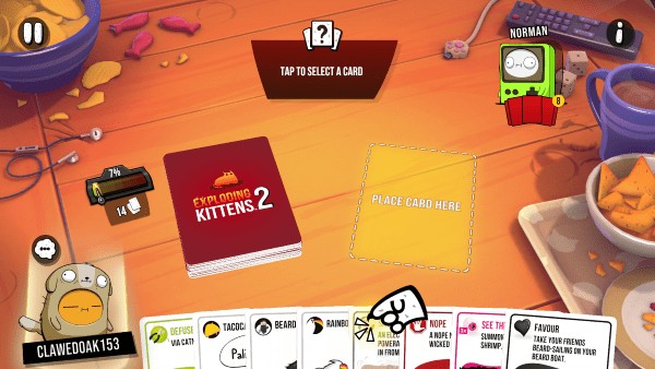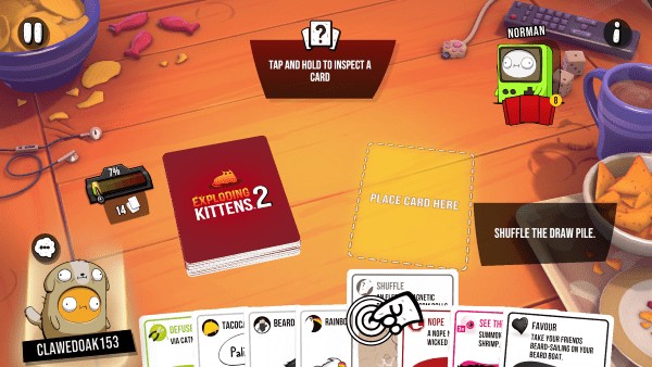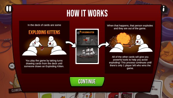 3、在这个多人猫咪卡牌游戏中,玩家抽卡直到抽到一张爆炸猫卡牌,自己飞到空中,然后就出局了,除非有一张解除猫咪武装的卡牌。