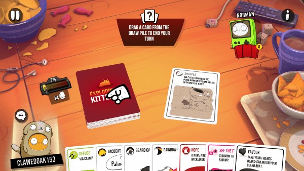 2、抽签完成这一轮。当然,使用skip可以让你跳过这一轮,而不必玩或抽牌,你总是冒着遇到炸弹猫的风险。