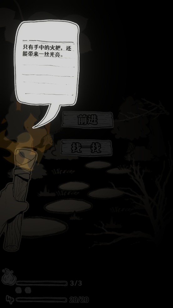 3、游戏内玩家们可以自由的选择前进或者是找一找,游戏里有着很多的道具和建筑等待着玩家们发现,玩家们还可以在这里选择休息或者是继续前进,休息了一段时间恢复了5点生命值火把亮度提升。