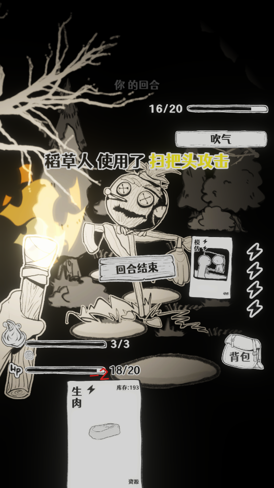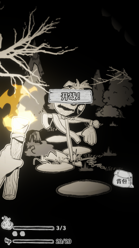 2、血量上方,这里是火把的耐久度每2个回合火把的亮度会下降1格,当亮度为0的时候,就会陷入黑暗,有一些卡牌可以增加伙伴的耐久度,当亮度超过上限的时候,就会进入光亮。