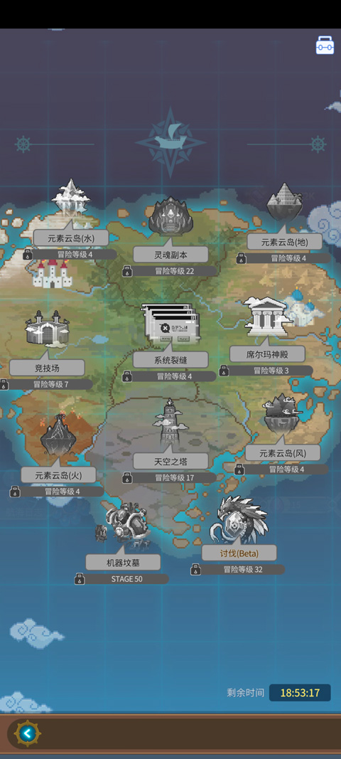 5、界面中心右侧是世界地图,到达一定的级别后会提式你点击它去另外一个地方执行挑战任务;