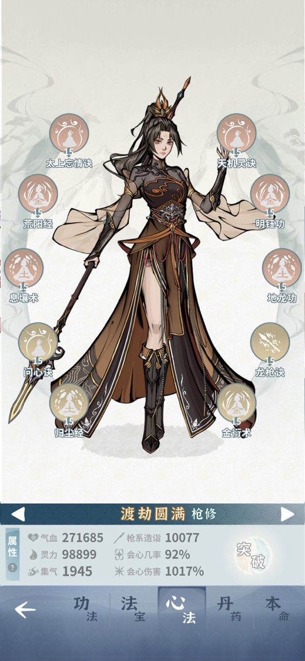 学到两门心法时,提升到十重,基本上锁妖塔可以速刷了。因为心法提升,消耗大量灵石和修为,基本上每天的精力都换成修为了(第十重需要16w修为合灵石)注意师姐心法金鼎功金系护盾提升基础伤害,记得把装备词条换成金系护盾(1命是开局直接放技能叠盾)