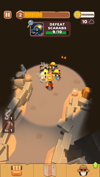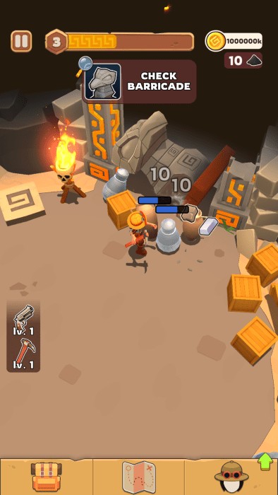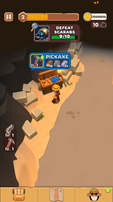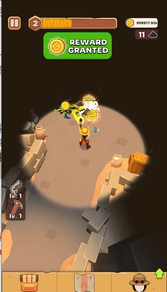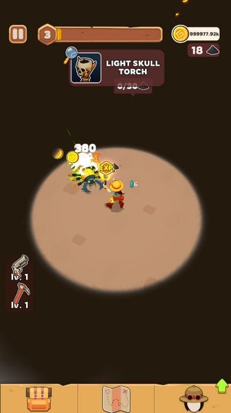 2、使用镐可以打破障碍和文物,玩家需要不断收集资源以制作更强大的装备。