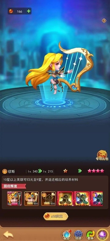 归元主要用于打造9星狗粮,用于强力英雄进一步升星。由于也需要消耗“转生精华”,前期不建议随意把英雄养到10星以上。