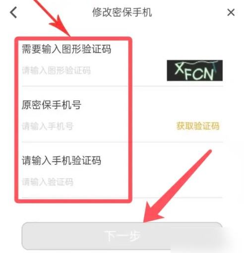接着输入原来手机号,获取验证码,点击下一步进行【解绑】更换即可。