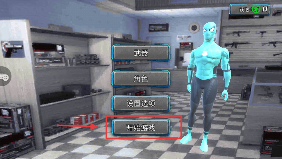 1、进入游戏主界面后,先确认【武器】【角色】设置无误,点击【开始游戏】按钮开启关卡,右上角【获取金币-0】可后续收集。