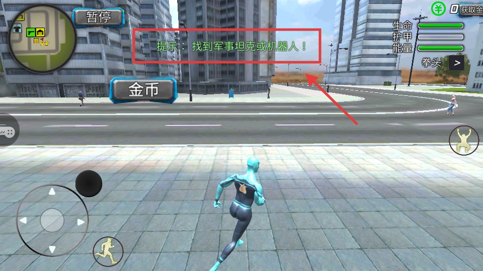 2、游戏内出现提示【找到军事坦克或机器人】,注意右上角【生命】【护甲】【能量】状态,可用【拳头】攻击目标。