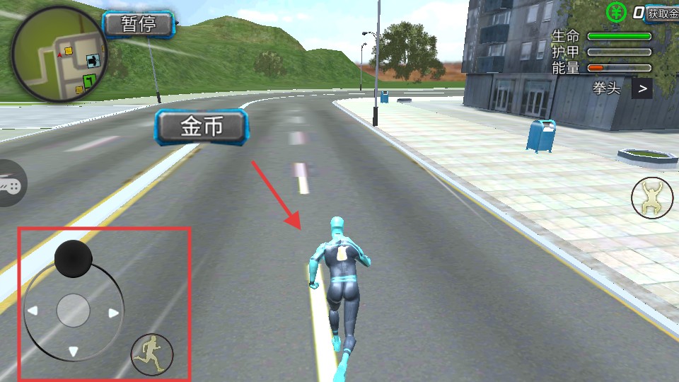 3、用左下角【虚拟摇杆】控制角色移动,沿着道路前进,留意路边的【金币】图标,及时收集提升资源。