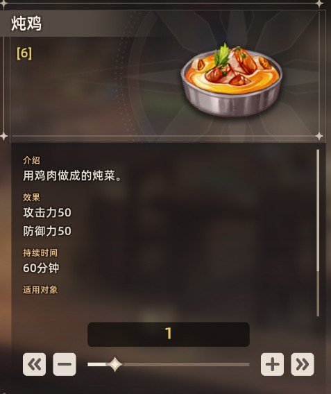 炖鸡:村庄杀鸡,然后用掉落的鸡肉在制作页面的,加成虽然蚊子腿,但总比没有好。