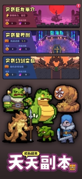 游戏采用了精致的像素风格,让人感受到怀旧的乐趣。美丽的像素图形和可爱的角色设计,让每个冒险都充满乐趣。而丰富的活动和副本设计,不仅增加了游戏的可玩性,还为玩家提供了每天的乐趣和奖励,极大提升了玩家的投入感和成就感。