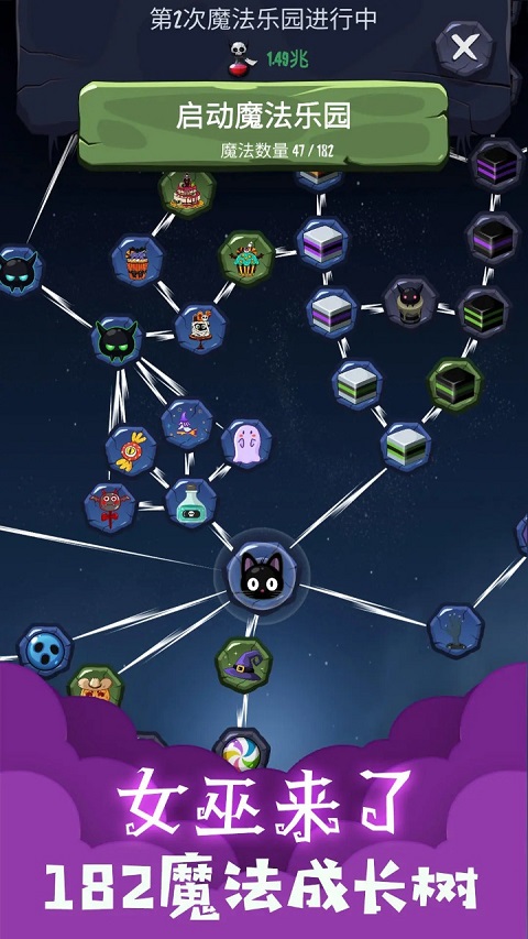 1、在界面底部有黑魔法、配方、活动、成就、捣蛋鬼、统计以及设置,通过自动挂机的“战斗”,收集魔鬼糖浆,并在黑魔法中,升级魔法。