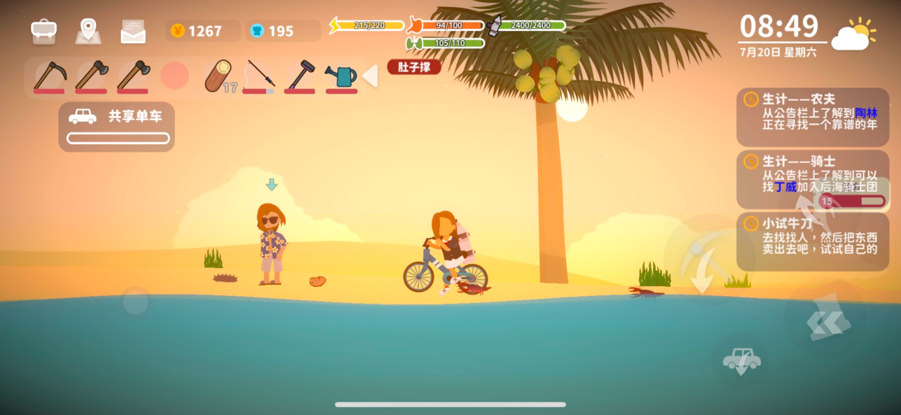 3、共享单车2r每次(上下车算一次,需规划好行程。车上可对话,购物,但限街道上镇民),骑行时加速可消耗精力值获得活力经验(红色)。