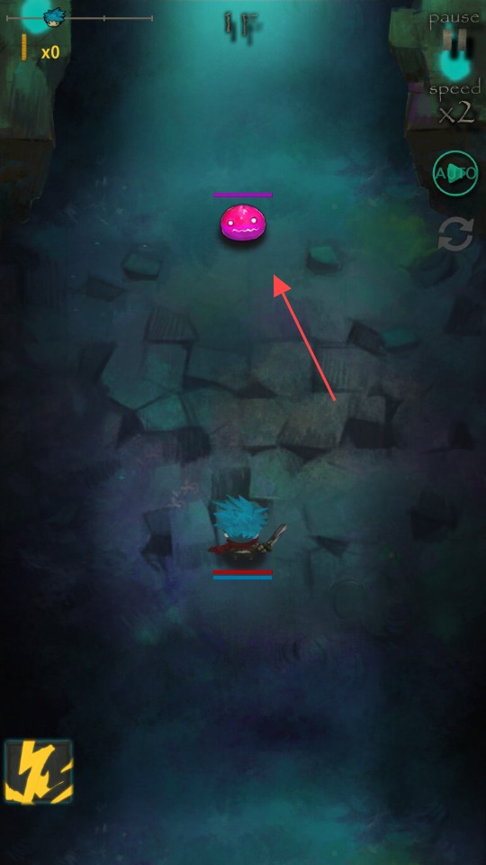 3、进入战斗场景后,根据箭头提示,操控角色攻击粉色怪物,熟悉战斗操作,推进游戏进程。