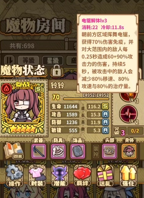 铃铃:这个魔物有着高额的基础生命和成长生命,在后期会变得非常肉,并且攻防属性和敏捷属性也达到了较高的水准,因此进攻端也同样颇具优势,她的技能还可以通过挥砍电锯来获取高达70%的免伤,此后还会在五秒内持续伤害敌人,伤害敌人的同时还能降低它们80%的移速,攻速与治疗量!
