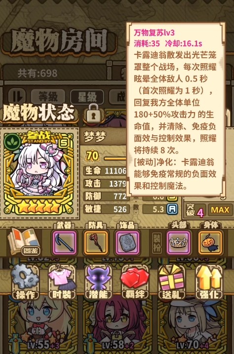 梦梦:这个角色是一个兼具坦度与控制的前排魔物,她的强势之处在于技能可以眩晕敌人,施放技能时她会持续散发光芒,光芒每次照射敌人都会将其眩晕0.5秒,并且首次照耀时还能为友军回复大量生命值,同时清除他们身上的负面状态。