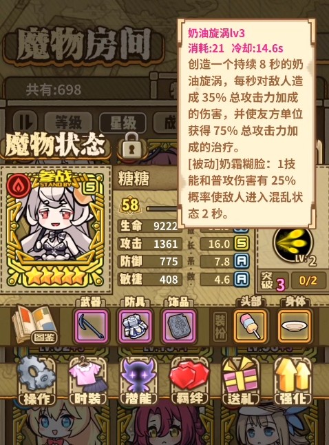 糖糖:这是一个偏向输出的五星魔物,有着S级的攻击属性,成长属性也相当高,值得一提的是它的技能可以制造一个奶油旋涡持续伤害敌人,同时还能为附近的友军回复血量,此外它还有一个被动能够让普攻和小技能有25%几率让敌人混乱,所以糖糖算是兼具了AOE伤害,治疗和控制的强力五星。