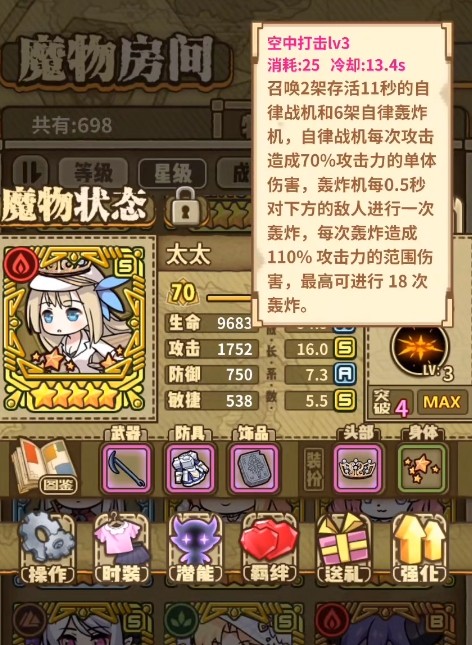 太太:她是为数不多有着双S属性的魔物,作为一个五星魔物,她的攻击和敏捷都非常高,并且技能还可以召唤额外的战机,战机会持续攻击对手,并且期间还会对敌人进行轰炸,轰炸的伤害和轰炸的范围都非常高。