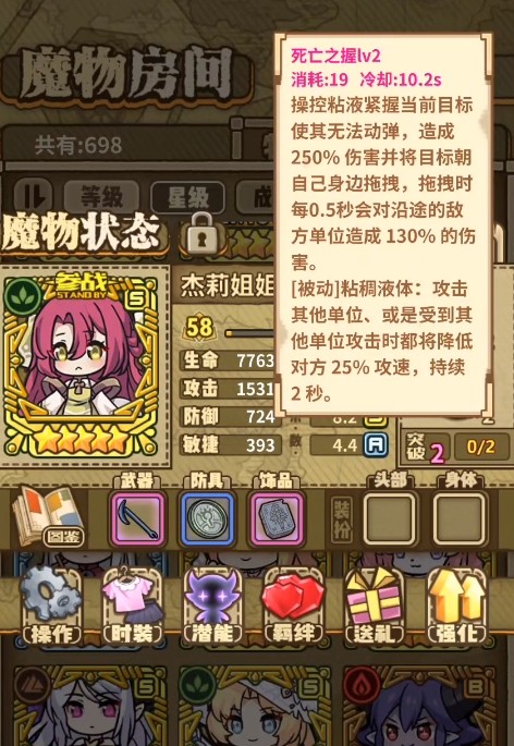 杰莉姐姐:她是一个坦度和牵制作用都挺高的五星魔物,属性方面,她的防御达到了顶级水准,技能的话则可以对单体目标造成250%伤害并令其无法动弹,之后还会将目标朝自己身边拖拽,每次拖拽都会造成130%的伤害,此外她无论是攻击还是被攻击,都会令敌人降低25%的攻速!