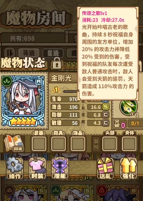 金刚光:她是优点和缺点都很明显的一个魔物,属性上虽然也有着顶级的攻击力属性,但防御和敏捷却比较一般,技能则主要是增益友军,使用后可以增加附近友军20%的攻击力并降低她们20%的所受伤害,此外被增益的友军如果受到了敌人的普攻,那么天上就会降下箭矢,从而对敌人造成110%攻击力的伤害。